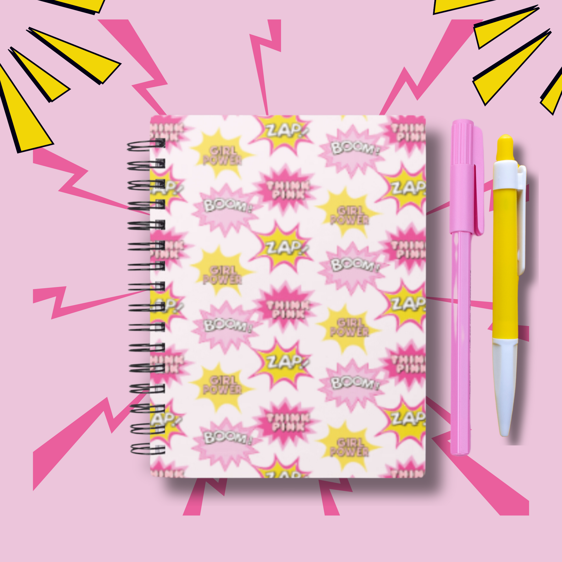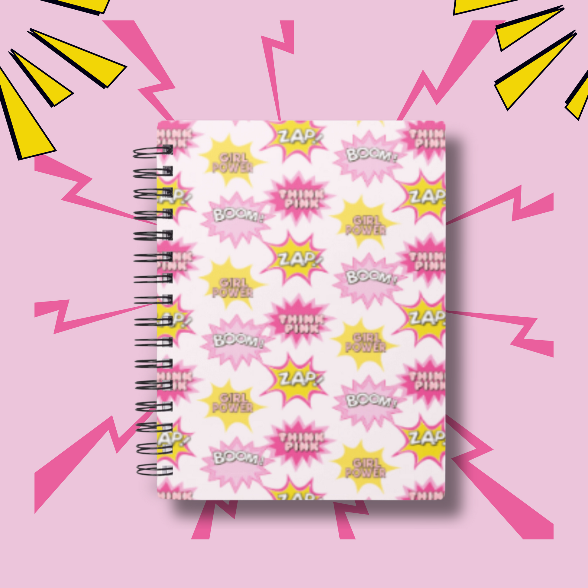 This striking notebook is splashed with dynamic superhero-themed words like 'Boom!', 'Girl Power', 'Zap!', and 'Think Pink', all set against a bold pink background that’s sure to stand out.